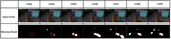Furthermore, the F-measure of each category is presented in Table 8. The proposed method gave superior results in the bad weather, camera jitter, intermittent object motion, low framerate, and turbulence categories. Especially, the F-measure of the camera jitter, low framerate, and turbulence categories increased about 4.3%, 5.5%, and 11% compared to the second-best method, respectively. For the dynamic background and shadow categories, our method ranked second. However, our method was not good at the night video and PTZ categories. The reason was that the proposed algorithm could only deal with background movements in a small range.