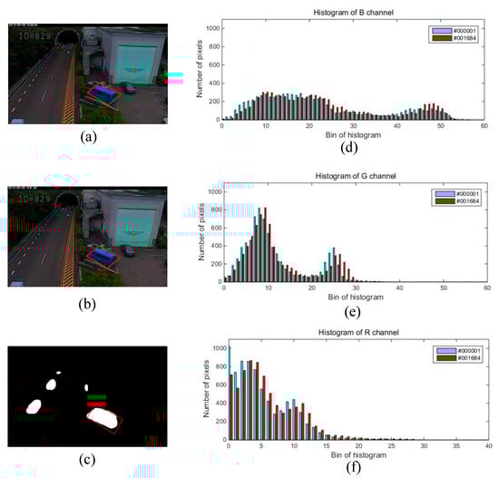 Taking the “tunnelExit_0_35fps” video sequence as an example as shown in Figure 3, we analyzed the formation process of ghosts caused by an object that existed in the first frame. There was a static blue minibus from #000001 to #001683 (marked using red □) in this video sequence. It started moving from #001684, and a few foreground pixels were detected in the region where the blue minibus was located. Then, foreground pixels continued to increase until the moving object and its ghosts separated, as shown in #001685, #001686, and #001687. Finally, a stable ghost region was formed in #001688 and #001689 frame (marked using red □). Of course, this process is only a necessary condition for the formation of ghosts because this situation can also occur when a normally moving object becomes motionless. However, as shown in Figure 4d–f., the histograms of the ghost region (marked using red □ in Figure 4c had high similarity on the #000001 and #001684 frames. On the contrary, the similarity of the static foreground region was often very low on the first frame and the frame appearing objects because of the difference of background and objects. Thus, we could utilize this characteristic to distinguish the two case. Here, we needed to solve the following four issues.