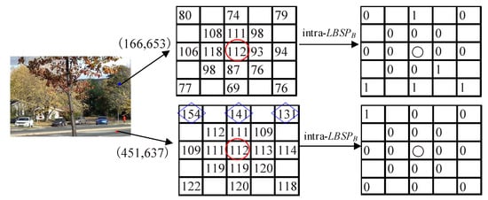 where , , , and are the color intensity of RGB three channels at location , respectively. , , and are the intra-LBSP texture feature [], which can be defined as