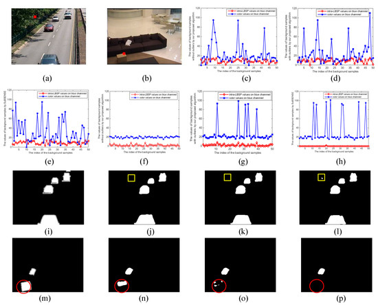 As an example of the pixel (37, 102) on the #001430 frame from the “highway” video sequence and the pixel (194, 73) on the #001030 frame from the “sofa” video sequence in Figure 7, Figure 7a,b show the location of two pixels in the original frames. The former locates in the dynamic region and the latter locates in the static region. Figure 7c–h are the color and intra-LBSP features in background sample set obtained on blue channel using three methods: Our proposed algorithm with and without outliers, and SuBSENSE. Here, the intra-LBSP features were defined as the number of “1.” Table 1 lists MSE of color and LBSP feature in background sample set on three methods. It is not hard to find from Figure 7f–h that our proposed method could obtain richer LBSP texture features at location (194, 73) than SuBSENSE, which can also be illustrated by a larger LBSP MSE in Table 1. This was beneficial to detect camouflaged static foreground objects. Then, we can see by comparing Figure 7d,e with Figure 7g,h that the color and intra-LBSP features at location (37, 102) were more widely distributed than those at (194, 73) using our proposed algorithm with outliers and SuBSENSE. The similarity threshold at location (37, 102) should be set to a larger value. However, the difference of the color MSEs was small at two locations. That is because some outliers (i.e., foreground pixels, noise) were included in the background sample set. It is easy to cause the camouflaged object to go missing, which can be demonstrated by the missed box in Figure 7o,p (marked by red 〇). Thus, these outliers were excluded in our final algorithm (see Equation (22)) for detecting the camouflaged object (see Figure 7n). Moreover, since the distribution of the background sample set was more disperse at location (37, 102), the difference of the color MSE without outliers or with outliers was not obvious. Therefore, outliers only had a great influence on the static flat region. In addition, although our proposed algorithm without outliers had a smaller color MSE (21.57) than that of SuBSENSE (24.55) on pixel (37, 102), the dynamic background (marked by yellow □) was still suppressed, as shown in Figure 7j. It attributes to our two-layer background model, since the periodic motion background samples were stored in the candidate model and could match with the current pixel.