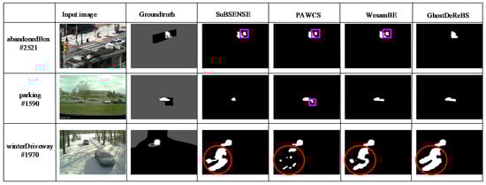The critical ghosts appeared in intermittent object motion (IOM) category and in “tunnelExit_0_35fps” video sequence of “low framerate” category on the CDnet2014 Dataset. In Section 2, we discuss the “sofa” and “tunnelExit_0_35fps” video sequence in Figure 2 and Figure 3. It can be seen that our proposed method removed ghosts. In order to analyze the advantages and disadvantages of our proposed method, we tested more video sequences in Figure 8, which included the “abandonedBox,” ”parking,” and “winterDriveway” scenario in the IOM category. In the “abandonedBox” scenario, there was a red box on the road from the first frame, and then it started to move from the #2446 frame. In the “parking” scenario, there was a white car in the parking lot from the first frame and then it was driven away from the #1334 frame. Both the red box and car in the two video sequences were used to model the background, hence ghosts often occur (marked by pink □) after being moved away in most of detection method. However, our proposed algorithm effectively removed ghosts. It is well known that no algorithm is omnipotent. Our proposed method could not remove ghosts when the background changed, as shown in “winterDriveway” scenario in Figure 8. In future work, we will extend our method to adapt to background changes.