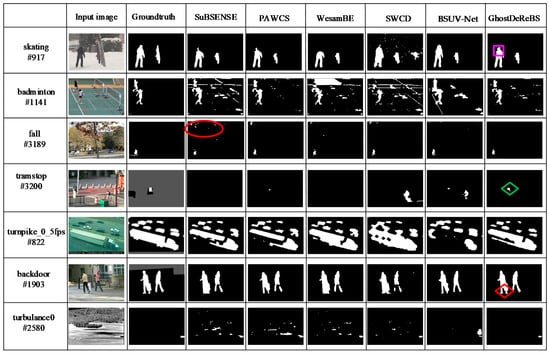 In this section, we demonstrate the effectiveness of our proposed method by comparing Re, Sp, FPR, FNR, PWC, Pr, and F-Measure with those of the state-of-the-art change detection approaches. The website on changedetection.net (CDnet) reported detailed segmentation results and evaluation data of dozens of change-detection algorithms on CDnet. In this paper, we systematically compared the proposed method with several related the state-of-the-art methods, such as SuBSENSE, PAWCS, WeSamBE, SWCD, SharedModel [], and BSUV-Net []. First, the average performance of several algorithms is summarized in Table 7. By observing Table 7, we can see that our proposed method had the highest recall (0.8456) and the lowest FNR (0.1544). In particular, the recall obtained by our method outperformed the second-best method (SuBSENSE) by about 3.3%. The precise achieved by our method was ranked second. Meanwhile, the F-measure value (0.7898) was improved by 3% compared to SWCD and was even better than BSUV-Net. Thus, the proposed method was in competition with best methods.