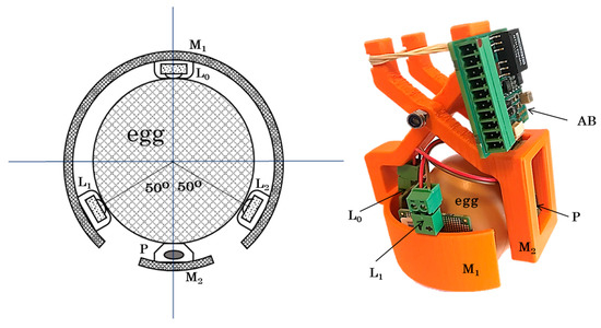 A three-dimensional (3D) printed plastic housing system (HS in Figure 2) was designed to contain the three LEDs (L0, L1, and L2) and the photodiode (P) around the egg (see Figure 2). The housing system (HS) consists of two sections: the largest (M1) was designed to hold the three LEDs around the egg with the possibility of placing each LED around the vertical axis of the egg (see Figure 2); the small section (M2) held the photodiode (P) tightly around the egg.