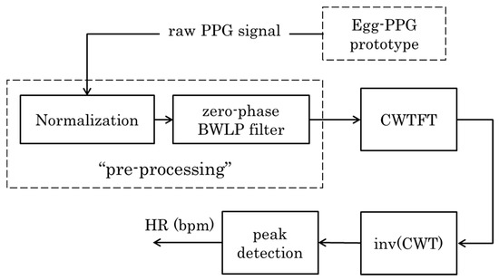Block diagram showing the main signal processing steps to extract the embryonic heart rate using the Egg-PPG prototype. The block diagram includes the pre-processing, continuous wavelet transform Fourier transform (CWTFT) algorithm, inverse continuous wavelet transform (invCWT), and peak detection algorithm blocks.