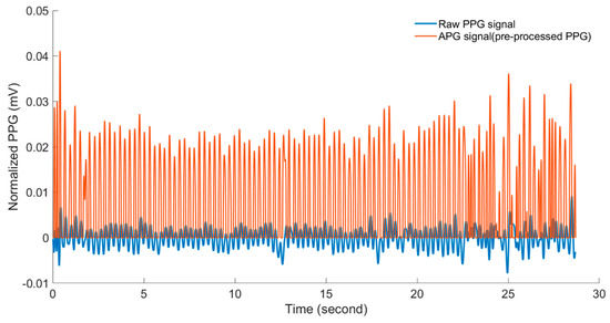 Firstly, the PPG signals are normalized to zero mean and unit variance [29]. The normalized signals are filtered using a zero-phase 4th order Butterworth low pass (BWLP) filter with a cut-off frequency of 7 Hz. This cut-off frequency is chosen to contain, in the filter passband, the documented (e.g., [3,10,14,30]) physiological heart rate range (160–300 bpm) of the chicken embryo during different developmental stages. The Butterworth filter provides a maximally flat passband and the zero-phase implementation to preserve the embryonic cardiac wave. The second derivative of the PPG signal, also called the acceleration plethysmogram (APG), shows more defined peaks than those of PPG signal, which more accurately detect the heart rate [31]; the APG was used in the presented approach. Figure 4 shows an example of the resulting APG signal after pre-processing compared with the raw PPG signal obtained from an incubated fertile egg at embryonic day ED09. To further distinguish the cardiac wave peaks, positive values of the APG signal are squared, whereas negative values are equated to zero (see an example in Figure 4).
