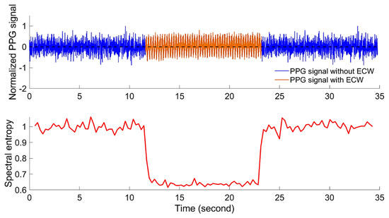 where is the probability density of the PPG segment obtained from an interfile egg, which represents, in our case, the maximal spectral entropy. Hence, it is expected that the normalized spectral entropy () of the PPG signal is equal to or closer to unity in the absence of cardiac events.