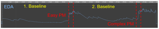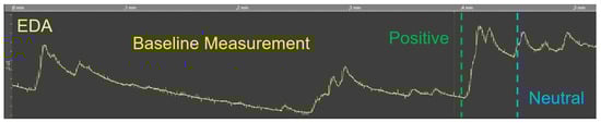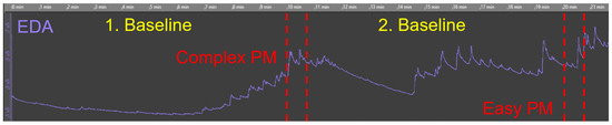 - Baseline measurement: The baseline represents the average skin conductance level during rest and without the presence of any stimulus. Moreover, the baseline varies over time depending on various factors (i.e., physiological or psychological arousal). Therefore, it is of importance to identify a baseline level for each individual separately before the start of an EDA measurement. There are different recommendations regarding the duration of the baseline measurement, but most of the research recommend a duration between 10 and 15 min [47,51]. In our studies, we could observe that the EDA signal stabilized at a low level after about 8 minutes. In addition, the baseline measurement can be used for a more fine-grained analysis of the EDA. For example, individuals can be identified that are hyper- or hypo-responders to a stimulus. Further, during relaxation, the identification of the frequency of non-SCR (see Section 2.1) is simplified [76].