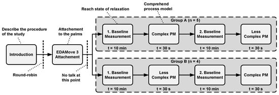 - Limit physical activity: The EDA is a very sensitive signal, and even small movements (e.g., finger movement) may cause changes in the respective signal. Depending on the accuracy of the EDA sensor device used, even contemplation may change the EDA signal. Therefore, in order to avoid such changes, we ensured that the participants in our studies did not have to perform any additional activities and could, therefore, concentrate on the comprehension of the presented process models.