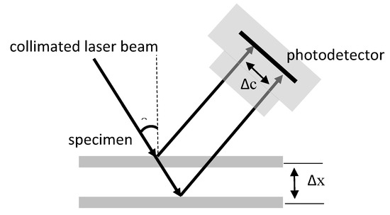 Currently, state-of-the-art methods for measuring the motion of living tissues are based on an optical system, such as optical triangulation [15,16,17,18,19,20], high speed optical imaging [12,21], optical coherence tomography (OCT) [22,23] and image correlation computation [14,24]. Optical systems can be further broadly classified as nonimage-based and image-based systems. Among them, the optical triangulation method is one of the most famous nonimage-based methods to measure small displacement of the specimen [15,16,17,18,19], which has a well collimated laser beam to irradiate the surface of the specimen at a certain angle, as shown in Figure 1. The displacement of the specimen ( Δ x ) can be determined by detecting the displacement of the imaged laser beam spot ( Δ c ). The main advantages of the optical triangulation method are high speed and accuracy, based on which a lot of commercialized laser displacement sensors have been designed. The limitation of this method is the complex structure, which makes it not easy to integrate with the front end of a minimally invasive instrument. For the image-based system, the displacement of the living tissue is estimated according to the image captured by the image sensor (e.g., CCD, CMOS) through complex image processing [12,14,21,22,23,24]. The optical imaging system, especially the wide-field image system, has a simpler structure than the optical triangulation system, which makes it easy to be miniatured and integrated into a minimally invasive instrument, but it still has some limitations to measure the displacement of living tissues with image-based methods. One of the major limitations is that it commonly measures the movement of living tissues in the horizontal (X-Y) direction with high-speed optical imaging system [12,21], but it is not easy to measure the movement of living tissues in the longitudinal (Z) direction with a single-camera-based imaging system. Although the OCT method can achieve micron level measurement accuracy for the longitudinal movement of living tissue, the high measuring precision means a small measuring range [22,23]. Recently, a method that estimates 3D motion of living tissues by correlation computation has been proposed [14,24]. However it consumes a huge amount of time, which limits the sampling rate of measurements.