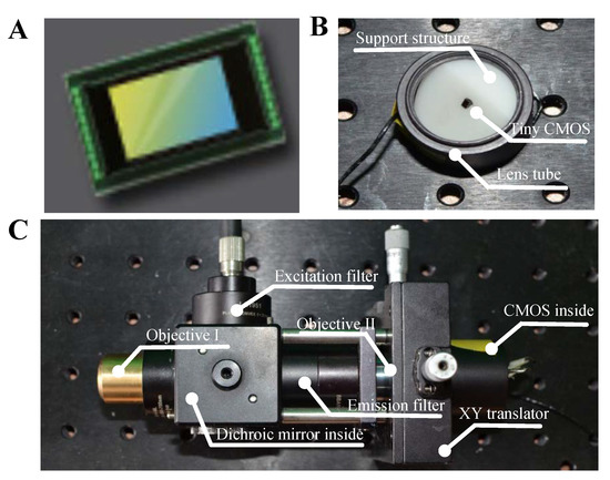We chose a plan achromat objective with 4X magnification (RMS4X, Thorlabs) and 10X magnification (RMS10X, Thorlabs) as optical lens I and optical lens II, respectively. A laser diode (wavelength: 445 nm, output power: 0–2 W) was used as the illumination source. The dichroic mirror (DM) (reflection band: 415–470 nm, transmission band: 490–720 nm, MD480, Thorlabs), excitation filter (center wavelength:445 nm, FWHM:45 nm, MF445–45, Thorlabs) and emission filter (center wavelength: 510 nm, FWHM: 42 nm) were selected based on the spectral characteristics of the fluorescent agent of proflavine (Sigma-Aldrich), which has a peak excitation wavelength of 445 nm and a peak emission wavelength of 510 nm [28,29,30]. The image sensor in our system (Figure 3A) was a tiny CMOS sensor (1280 × 720 pixels, pixel size: 1.116 μm, image area: 1.44 mm × 0.91 mm, die dimensions: 2.53 mm × 1.53 mm, OH01A10, Omni vision) and the frame rate of the tiny CMOS was 30 frame/s. To make the image sensor plane at an angle of 45-degree with the optical axis, we utilized a 3D printer to make a solid cylinder structure with a 45-degree slope to support and fix the image sensor. Then we put the printed support structure into a lens tube and fixed it by a retaining ring, as shown in Figure 3B. Finally, the lens tube with the image sensor was mounted in an XY translator (ST1XY-S, Thorlabs), which was used to align the image sensor with the optical axis. A photograph of the laboratory-built prototype is shown in Figure 3C.