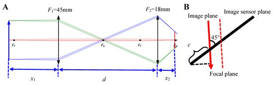 The quantitative relationship between the motion of the specimen and the formed image plane can be derived from the ray transfer matrix (ABCD matrix) [32,33,34]. Assuming that the focal lengths of optical lens I and optical lens II are F 1 and F 2 , respectively, the two optical lenses are separated by a distance of d , the specimen is placed at a distance of x 1   to the optical lens I and the image plane is at a distance of x 2 to the optical lens II, the optical scheme can be simplified as shown in Figure 4A.