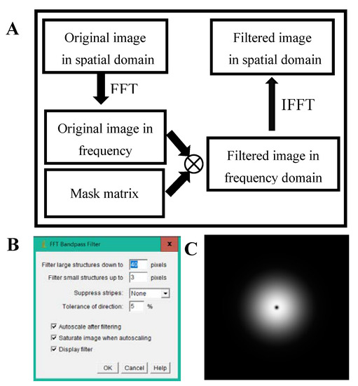 Figure 5. (A) The generalization process of bandpass filter based on fast Fourier transformation (FFT). (B) The parameters of the mask matrix with Image J software. (C) The mask matrix of the bandpass filter generated by Image J software.