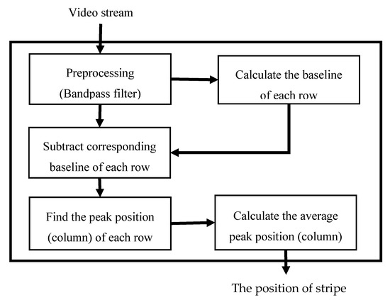 Figure 6. Flow chart for estimating the position of the stripe. In the algorithm, the input video frame is first preprocessed by a bandpass filter to eliminate baseline drift, and then the baseline of each row is calculated. Next, subtract the baseline of each row for the filtered image. Subsequently, find the peak value and corresponding position (column) for every row. Finally, calculate the average position (column) based on the peak position of individual rows.
