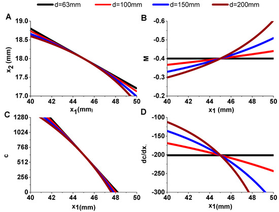 Figure 7. Simulation results with conditions of d = 63   mm   ( F 1 + F 2 ) , 100   mm , 150   mm , and 200 mm. (A) The changes of distance from image plane to optical lens II ( x 2 ). (B) Magnification of optical system ( M ). (C) Position of stripe in the captured image ( c ). (D) Measurement sensitivity ( d c / d x 1 ) with respect to distance from specimen to optical lens I ( x 1 ).