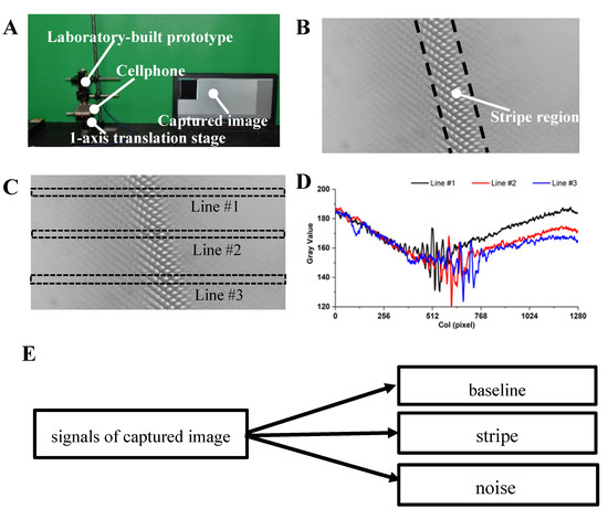 Figure 8. Functional test experiment. (A) Experiment setup including the laboratory-built prototype, a 1-axis translation stage and a cellphone. (B) Image captured by the laboratory-built prototype. (C) Dash line of the rectangular region is the selected region to be plotted. (D) The plotted profile of the selected region. (E) The captured image signal mainly consists of three components: baseline, stripe and noise.