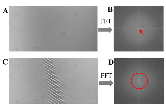 Figure 9. The frequency characteristic of the captured image. (A,C) Captured image in spatial domain without and with the presence of cellphone. (B,D) Captured image in frequency domain without and with the presence of cellphone.