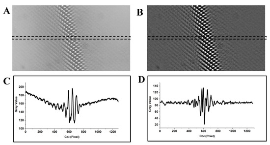 Figure 10. Comparison of the image in the spatial domain and the profile of the selected region before and after processing by bandpass filter. (A,C) Before processing by bandpass filter. (B,D) After processing by bandpass filter.
