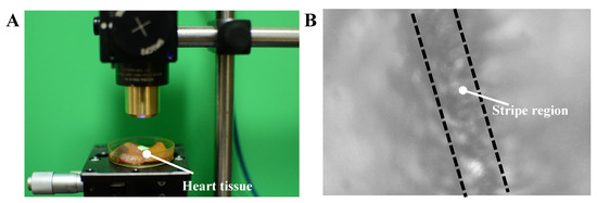 Figure 11. Calibration experiment. (A) A piece of heart tissue (pig) is placed in a dish and put on a 1-axis translation stage. Then the tissue is moved up by a step of length of 0.5 mm and the corresponding position of stripe is recorded in the image coordinate system. Above process repeated until the stripe moves from rightmost margin to the leftmost margin of the captured image. (B) Typical image of heart tissue recorded by the laboratory-built prototype during calibration experiment.