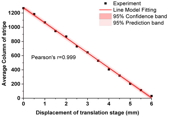 Figure 12. Calibration results of the laboratory built-prototype. Black squares represent the mean values of calculated stripe positions, red solid line is the fitting result, dark pink region represents 95% confidence band, and light pink region represents 95% prediction band.