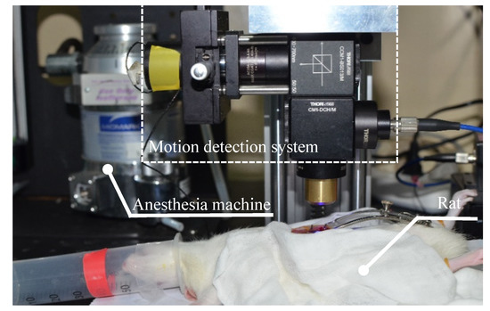 In order to demonstrate the effectiveness of the proposed method, we used the laboratory-built prototype to measure the movement of living rat tissues (liver) caused by respiration and heartbeat. Setup of the living animal experiment is shown in Figure 13, and the movement of liver in the image coordinate system is shown in Figure 14.