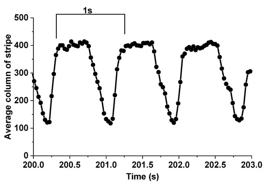 Finally, we examined the proposed image preprocessing method (a bandpass filter) to eliminate the effect of the baseline drift. An originally captured image and the corresponding filtered image are shown in Figure 10A,B, respectively. The profiles of the selected region of the original capture image and the filtered image are shown in Figure 10C,D, respectively. The comparison result reveals that the pixel value in the filtered image fluctuates around a horizon line (baseline) (Figure 10D), which indicates that the bandpass filter can perfectly eliminate the baseline drift. As the range of fluctuation is proportional to the clarity of the image, we can easily estimate the position (corresponding column number) of the stripe via detecting the fluctuation range around the baseline of the filtered image.