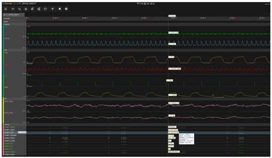 Adult patients (age ≥18 years) who underwent laparoscopic cholecystectomy under general anesthesia at Soonchunhyang University Bucheon Hospital, Bucheon City, Republic of Korea between 30 October 2018 and 31 July 2019 were included in this retrospective study. Vital records were collected from a Bx50 monitor, BIS monitor, Orchestra (Anesthetic pharmaceutical injection machine), and Datex-Ohmeda (Anesthesia machine-artificial breathing), using a vital recorder, and EHR data were retrieved from the database. The construction of the database was approved by our institutional review board (approval No. 2018-06-012). Additional approval from our institutional review board was obtained for this study (approval No. 2020-05-039). A snapshot of the vital recorder (https://vitaldb.net) is displayed in Figure 1. This vital recorder collects vital records from various devices and tracks patient status. Figure 1 visualizes the data of all parameters from various devices that collected during surgery. We selected the parameters related to the occurrence of hypotension among these data, and used them for training and testing to develop a hypotension predictive model. Lee et al. [22] predicted the bispectral index by constructing a long short-term memory and the feed-forward neural network model, using data collected from vital recorders. The entire dataset used in our experiment is listed in Table 2.
