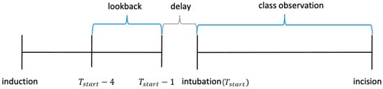 The hypotension was tracked before surgery and after intubation, regardless of its frequency. We defined a patient as someone who experienced hypotension at least once. The class was extracted as 1 if hypotension was present, and 0 if otherwise. Hypotension was defined as SBP < 90 mmHg or mean blood pressure (MBP) < 65 mmHg. The lookback period was set from the 1-min data just before tracheal intubation to the data for the preceding 3 min. Figure 2 shows how training data and their classes are set.