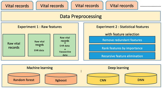 Our experiments are twofold. First, deep learning and machine learning models were built using raw data. For comparison, a predictive model is created using deep learning and machine learning models using statistical features extracted from raw data. For feature extraction, we adopt simple statistics, including min, max, mean, and standard deviation, to extract abnormal patterns. To determine the best combination of features, we perform the feature selection as well and compare the performance. Figure 3 shows the framework of developing the post-induction hypotension prediction model with comparative analysis of traditional machine learning and deep learning. We explore three datasets of raw vital records, EHR and vasoactive drug for deep learning. For deep learning, we test two models of CNN and DNN.