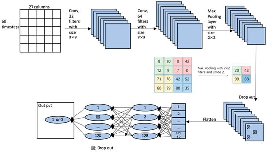 For CNN, although the data are different for each patient, the input was sliced into 60 data points and each point was 3 s, reflecting the lookback period, which was 3 min in Figure 2. The input is an image-like matrix with a size of (60, 27, 1), where 60 refers to the length of time steps and 27 are the features.In the CNN, to find the hyperparameters, the autokeras, a keras package built in R to find the optimal model. The optimal model consists of 2 convolution layers and a 1 max pooling layer, as shown in Figure 4. The convolution layer consists of several convolution filters that selectively extract the input value. The pooling layer taking the max of the values wrapped by the filter. For the hidden layers, we adopt a ReLU function as an activation function. After reducing the dimension by convolution layer and max pooling, it goes through a flattening process to convert it into one dimension and send it to the fully connected layer. In the fully connected layer, the activation function is set to a sigmoid function. The RMSProp is used as the optimizer to make the learning speed fast and stable. In addition, a drop-out layer is used to avoid overfitting.