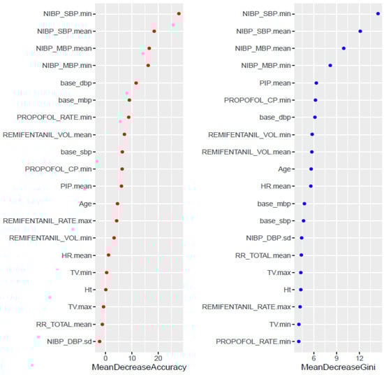 Feature importance was determined for the final model, if this is a possibility for the given machine learning algorithm, as not all machine learning algorithms are amenable to computing variable importance. Feature importance is computed based on how important any given feature is to aid in the classification process when the classifier is built, determined by its effect on the performance measure [30]. Generally, feature importance helps to assess the impact of any given variable on the performance of the algorithm. If a variable with high importance is permuted or removed from the model, the performance decreases. The greater the importance, the more essential the variable is to the performance of the model. Figure 6 shows the importance of the statistical features. Overall, the min and mean of NIBP_SBP and NIBP_MBP have high importance in terms of the accuracy and the gini index.