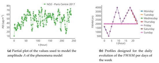 The FWHM represents the spread of the pollutant around the source. Two linear piecewise functions are defined to represent the daily evolution of the FWHM: one for weekdays and one for weekends. They are represented in Figure 4b. Their shape is inspired from the dataset used for the amplitude A. This is not fully realistic, but it provides an order of magnitude of spatial and temporal variations occurring in urban context.
