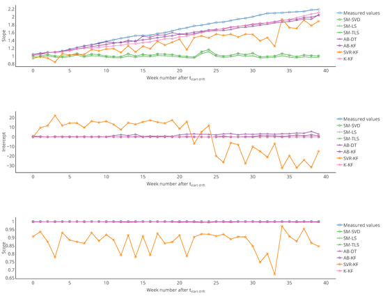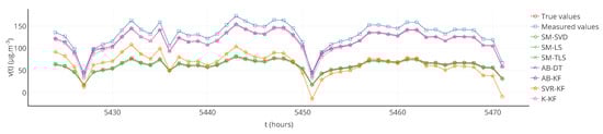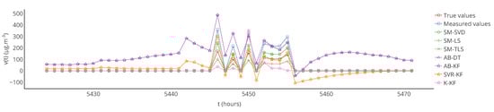 - Takruri et al. [29,30,32]: Three contributions from these authors are considered. The first one is based on the idea that the average of the values of neighbouring sensors gives a good estimation of the correct value of a sensor to calibrate. If the absolute difference between the sensor value and the average is greater than a given threshold, this difference is added to the sensor’s value. We call this strategy AB-DT (average-based estimation for difference-based threshold). Two variations are also proposed, a first one in which the difference-based threshold mechanism is replaced by a Kalman filter that estimate the error affecting the instruments (AB-KF), and a second one where the average-based part is replaced by support vector regression (SVR-KF).