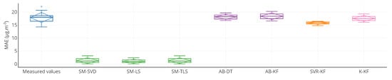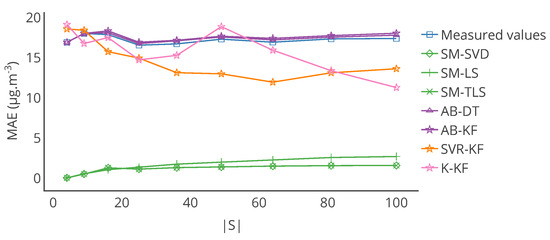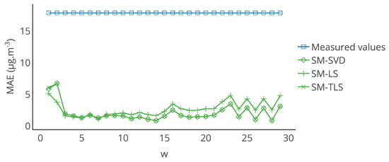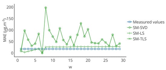 Evolution of the mean of MAE, computed on the entire time interval of study, over the network for the strategies SM-SVD, SM-LS and SM-TLS as a function of w. The best result is obtained for , which was our original value in Section 4, considering the average error of the three strategies for the same w.