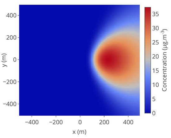 A space of is considered. It is discretized with a step of 10 m. At the center of this area, a source is considered. The concentration of , C, at the instant t and position , is modelled as: