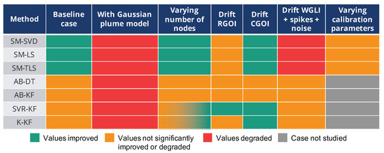 Summary of the results observed by changing the parameters of the baseline case study which was built with a 2D Gaussian function to model the measurand, with the WGLI drift model applied to the measured values of the instruments, with 16 nodes in the network and the values indicated in Section 4 for the parameters of the in situ calibration algorithms. The improvements are judged relatively to results of the baseline case, recalled in the first column. Thus, this table does not indicate that the corrected values are very close to the true values when the measured values are improved.