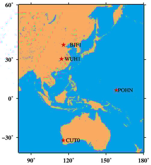 Distribution of the four selected global navigation satellite system (GNSS) stations.