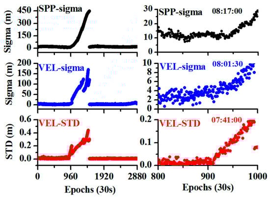 Comparison of different approaches for the detection of the orbital maneuver (the black color represents the mean square error (MSE) for single point positioning (SPP), the blue color represents the MSE for velocity estimation, and the red color represents the standard deviation STD for velocity estimation; the left plots denote the values of estimated parameters during one day, and the right plots denote the values of the estimated parameters during the maneuver period).