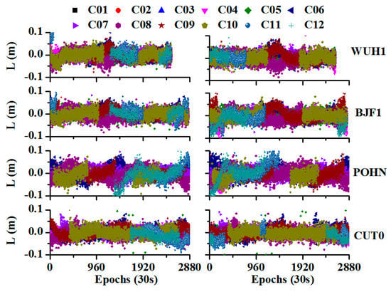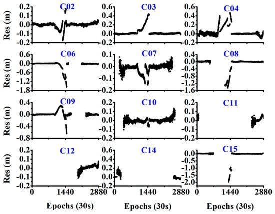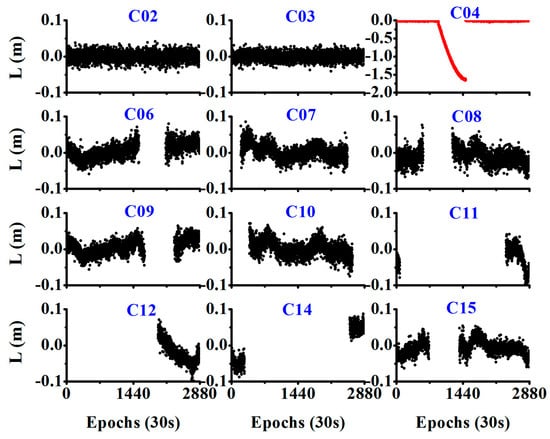 Observation residuals of different PRN satellites (Satellite C04 showed orbital maneuver from 07:00:00 to 13:00:00 as determined from the broadcast ephemeris).