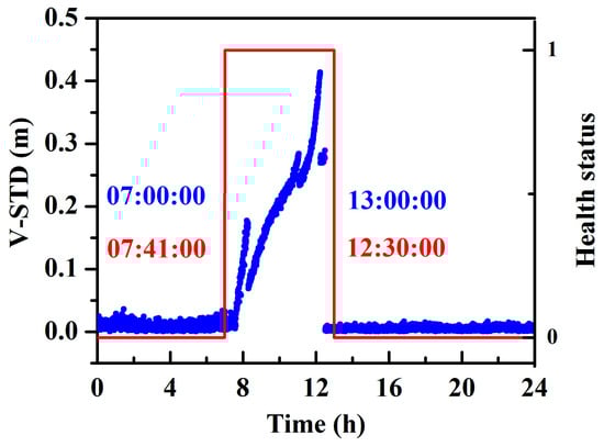 Comparison between the marked time of orbital maneuver by the broadcast ephemeris and real-time detection approach (health status: “0” represents healthy, and “1” represents unhealthy).