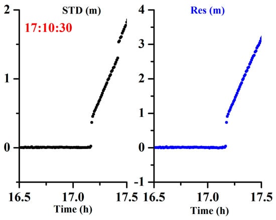 Time series of the STD of the observation residuals and array L for the global positioning system (GPS) medium earth orbit (MEO) satellites showing orbital maneuver (the left side represents the time discriminant factor, and the right side represents the satellite identification factor).