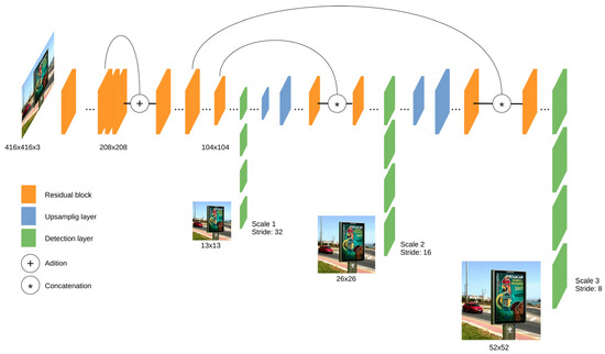 YOLOv3 [36] uses a variant of Darknet architecture and has 53 layers trained with the ImageNet dataset. For the object detection tasks, an additional 53 layers were added, and this model was trained with the Pascal VOC dataset. YOLOv3 outperformed most of the detection algorithms for real-time applications. Using residual connections and upsampling, the architecture can perform detections at three different scales from the specific layers of the structure. This makes YOLOv3 model more efficient when detecting small objects but, on the other side, it results in slower processing than the previous versions due to the complexity of the solution. Figure 3 shows a simplified layer structure of YOLOv3.