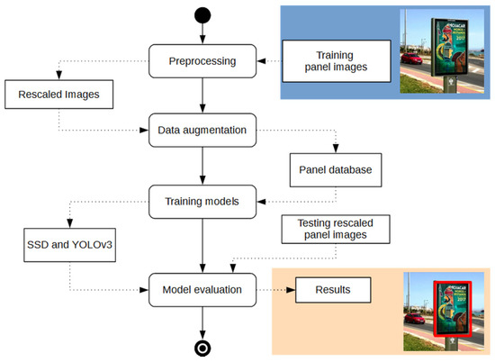 Figure 4 shows a UML diagram illustrating the stages followed in the proposed solution for both SSD and YOLOv3 models. First, the original set of training images was preprocessed and augmented to increase the size of the training dataset. Preprocessing included an image rescaling to adapt it to the respective sizes of the input layers of SSD and YOLOv3 networks. The neural architectures were trained, tested and compared using the same dataset and under the same evaluation metrics.
