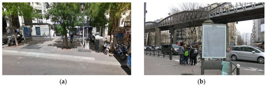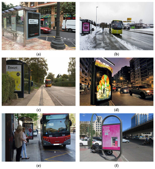 Two examples of Optical Point of Promotion and Information (OPPI) ads panels in urban outdoor images: (a) panel as a component of bus stop shelter; (b) independent panel.