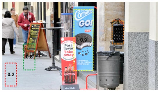 Previous works on billboard detection [18,21] have considered the detection problem as a semantic segmentation one, where classification and localization was performed at the level of image pixels. Moreover, the authors have used specific deep learning networks for such a semantic segmentation task. Although semantic segmentation can be employed for the detection of billboards, from the application perspective, the annotation of images semantic segmentation is much more time-consuming, which makes it challenging for collecting large datasets. Another point is that basic detection metrics for analysis such as True Positives (TP), False Positives (FP) or False Negatives (FN) make more sense and should be redefined at the “object” level (i.e., the billboards and panels) and not at the pixel level.