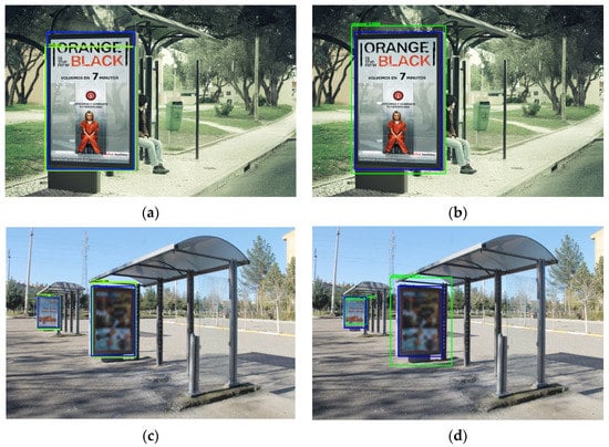As future work, we aim to slightly modify the architecture of these networks to improve the detection rate accuracy for the case of very small panels. More concretely, we will investigate specifically the “difficult” images where both detection networks have failed, as is the case with the example presented in Figure 13a. We also plan to extend our work for performing the detections in indoor scene images (e.g., shopping centers or malls) where these types of panels are also available. Another interesting future work consists in recognizing the elements contained inside the panels to determine the brand names, and also to use the panel detection results to update the publicity for Augmented Reality (AR) applications. Finally, we will also study how to adapt our experiments to the new version of YOLO (i.e., YOLOv4), which has recently appeared.
