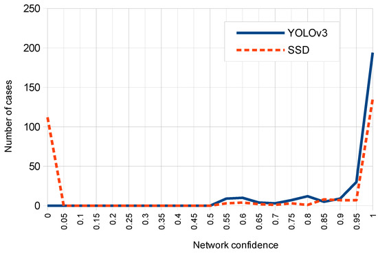 Figure 11 shows the corresponding histogram for both networks which relates the confidence returned by each network with the number of test cases. Note that for YOLOv3 most cases correspond to a high confidence value between 0.95 and 1, while for SSD the most returned confidence values on detections are distributed in ranges between 0.95 and 1 (first place) and between 0 and 0.05 (second place).