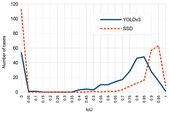 Figure 12 compares SSD and YOLOv3 with respect to the number of cases for each IoU computed result. Note that although SSD produces higher IoU peaks than YOLOv3, this second network presents a higher number of TP cases (since the area of the corresponding curve above IoU threshold of 0.6 is larger for YOLOv3 compared to SSD).