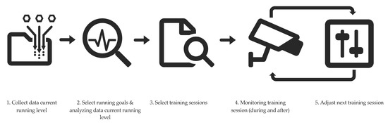 To create an algorithm that automatically adjusts the training scheme, we analyzed the approach that experienced coaches and trainers use when creating training schedules for runners. Interviews with experienced coaches and trainers (those who had at least 5 years of experience in coaching and training) revealed that in general, most coaches and trainers take the following steps (see also Figure 1).