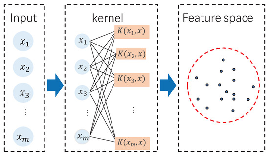 Given the normal training data set as with n samples, where is one sample with m variables, SVDD projects the original data onto feature space by introducing a nonlinear transformation . The training data in the feature space are expressed as: