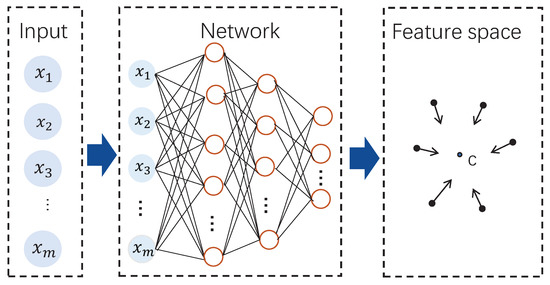 The deep learning based SVDD model was firstly discussed in Ruff et al.’s work [24,25], which performs deep network training with optimizing a data-enclosing hypersphere and achieves the successful applications the image processing field. In this paper, we design the deep SVDD (DeSVDD) based fault detection method. A DeSVDD framework is shown as Figure 2. Similar to kernel-based SVDD, DeSVDD aims to find a hypersphere in the feature space so that the hypersphere with the minimal radius can surround all normal samples. The biggest difference is that DeSVDD automatically learns useful data feature representations by multiple feature layers not by only one feature layer.